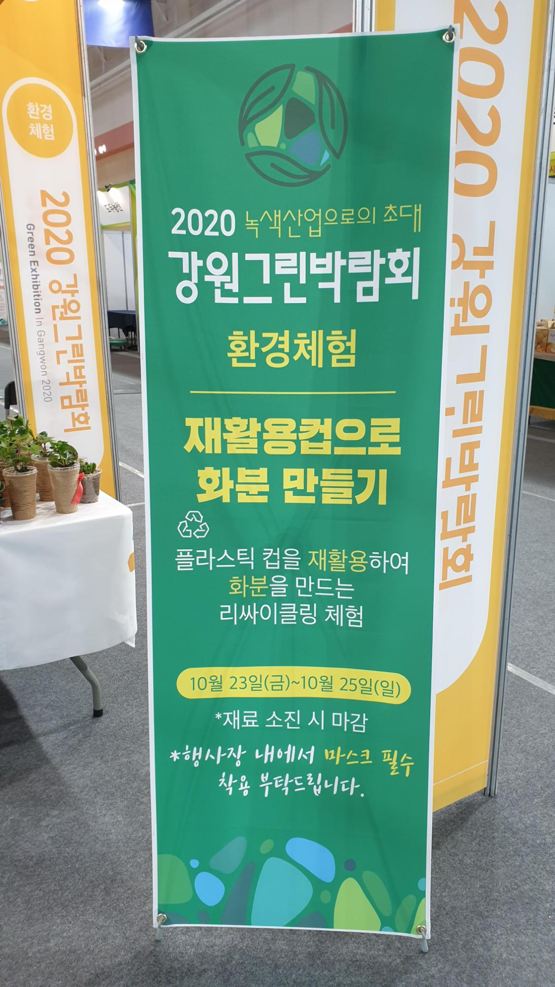 한국 힐링 교육연구원은 재활용 컵으로 활용한 컵화분 무료체험코너로 참가했다.  강원도와 춘천시가 후원한 이번 박람회는 ‘그린 뉴딜’에 발맞춰 청정에너지와 신재생에너지 정보를 교류하고, 청정·재생·친환경·바이오를 아우르는 그린산업 전반을 한자리에서 체험하는 매머드 박람회로 꾸며졌다.